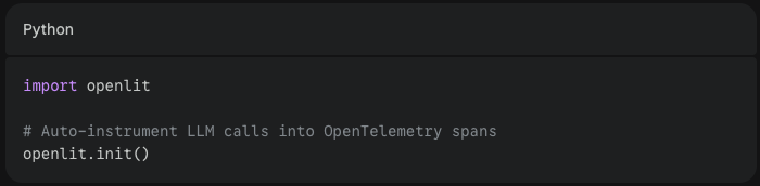 OpenLIT extends OpenTelemetry with GenAI specific semantic conventions. It autoinstruments frameworks like OpenAI, LangChain, and Ollama to emit spans containing model names, token counts, and request metadata.
